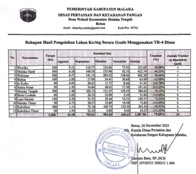 Laskarmalaka.com || Pemerintah Kabupaten Malaka melalui Dinas Pertanian dan Ketahanan Pangan terus melanjutkan program unggulan pengolahan lahan pertanian secara gratis bagi masyarakat. Hingga Rabu,26 November 2025, tercatat 2.387,96 hektar atau 79,60 persen lahan kering milik petani telah diolah menggunakan traktor (TR4).