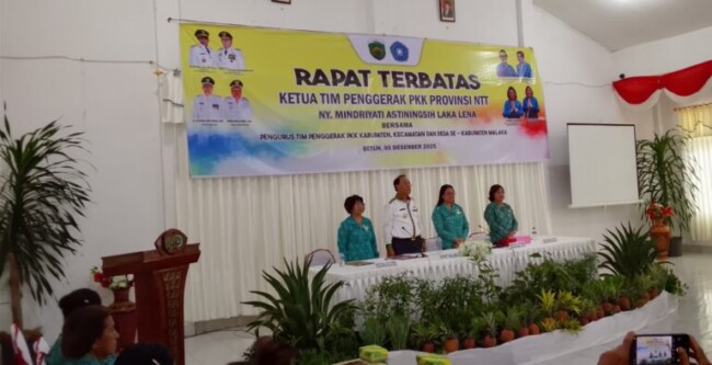 Laskarmalaka.com || Ketua TP PKK Provinsi Nusa Tenggara Timur, Ny. Asty, mengapresiasi inovasi dekorasi ruang rapat yang ditampilkan TP PKK Kabupaten Malaka dalam Rapat Kerja TP PKK Provinsi NTT bersama pengurus PKK kabupaten, kecamatan, dan desa se-Kabupaten Malaka, yang digelar di Aula Kantor Bupati Malaka.