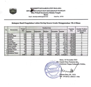 Laskarmalaka.com || Program olah lahan gratis bagi petani yang dijalankan Pemerintah Kabupaten Malaka per 16 November 2025 menunjukkan hasil progres mencapai 71,18 persen. Sejumlah kecamatan tidak hanya memenuhi target, tetapi juga mencatat capaian jauh di atas rencana kerja yang ditetapkan oleh dinas teknis.