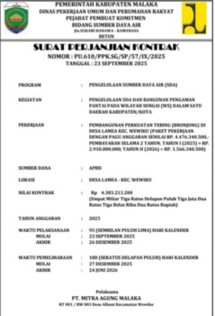 Laskarmalaka.com || Pemerintah Kabupaten Malaka melalui Dinas Pekerjaan Umum dan Perumahan Rakyat (PUPR) telah menandatangani kontrak pembangunan bronjong di Lamea dengan nilai Rp 4.383.213.200. Proyek ini dikerjakan PT Mitra Agung Malaka dengan periode kerja 23 September – 26 Desember 2025, dan dilanjutkan masa pemeliharaan selama 180 hari hingga Juni 2026.