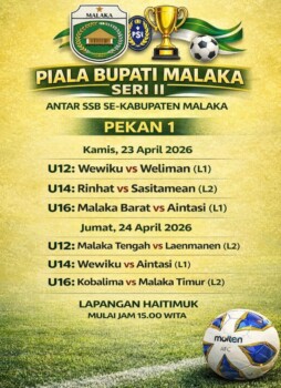 Laskarmalaka.com || Turnamen sepak bola usia dini Piala Bupati Malaka Seri II, siap digelar dengan melibatkan 10 Sekolah Sepak Bola (SSB) di Kabupaten Malaka. Turnamen ini akan resmi dibuka pada Kamis, 23 April 2026, di Lapangan Haitimuk, Kecamatan Weliman,pukul 13.00 WITA.